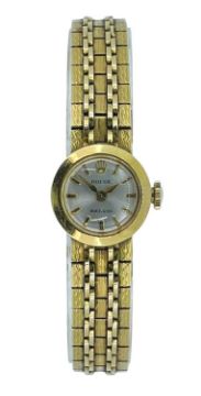 18CT GOLD ROLEX LADIES' 'PRECISON' BRACELET WATCH, case no. 1***1, Swiss cal. 1401 18J manual wind movement, silvered dial with baton hours and spade hands, engraved fancy link bracelet, deployant clasp, case, movement, dial and clasp all signed, stamped '18', 15mm diam., 31.4gProvenance: private collection CardiffComment: excellent