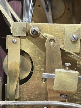 IMPRESSIVE MAHOGANY AND GILT BRONZE MOUNTED BRACKET CLOCK, 20th C., 7in. brass dial, silvered chapter ring with Roman hours and Arabic minutes, applied pierced spandrels, pierced arched allegorical grilles to the side, caryatid angles, grille door, pineapple finials, lions paw bracket feet, unsigned three-train movement striking 8-bells and a coiled gong, Westminster and Eight Bells chimes, strike/silent, regulator and chime selection dials to the arch, 72cms (h)Provenance: private collection north WalesComments: strikes most bells on the quarter and half hour, but not the gong, needs some adjustment/attention. Condition Report:the serial number stamped behind the pendulum is 1395
