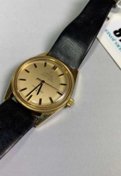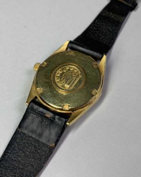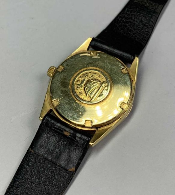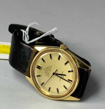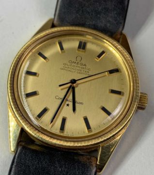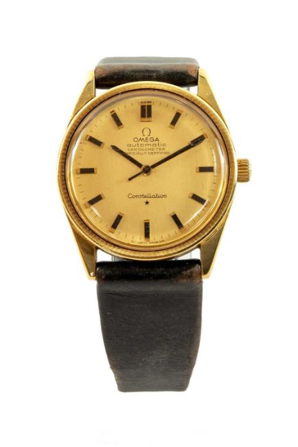 18K GOLD GENTS OMEGA 'CONSTELLATION' WRISTWATCH, ref. 1061, cal. 712 automatic 24J movement, serial no. 23652xxx, circa 1966, gold dial with applied baton markers, minute markers and sweep centre seconds, signed screwdown case with logo, aftermarket calf strap, 33mm. diam.Provenance: private collection SwanseaComments: minor surface scratches to case and glass, ticks when wound, not tested for accuracy, strap creased and worn. Due to the opening of the wristwatch case backs, it is recommended watches are re-sealed by professional technicians to ensure any stated water resistance is retained. 48.8g inc. strap