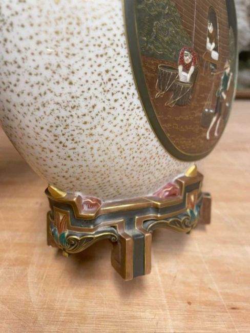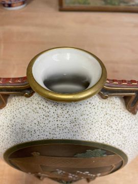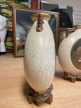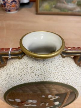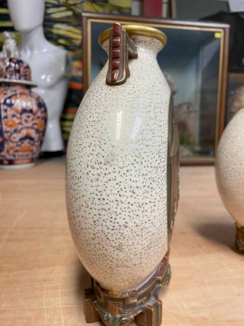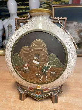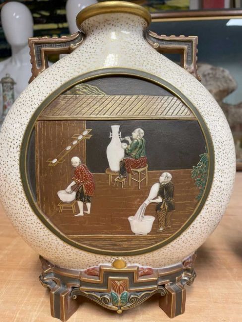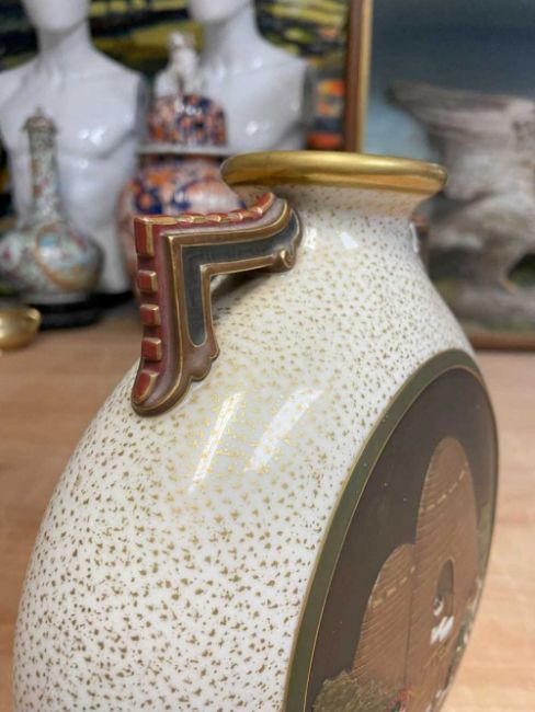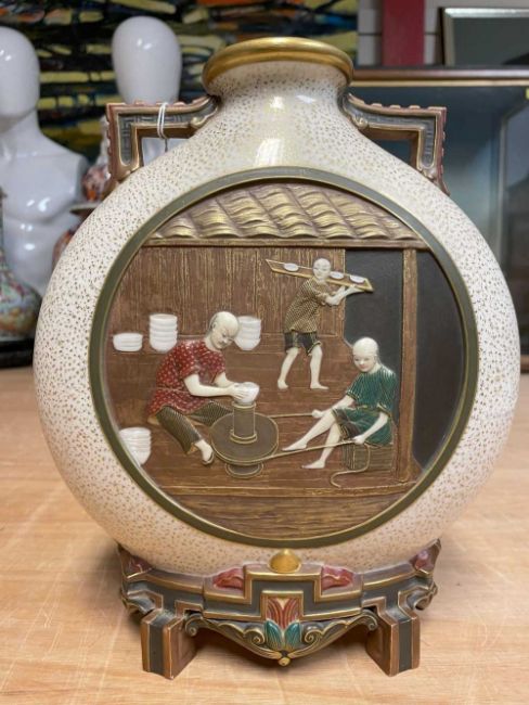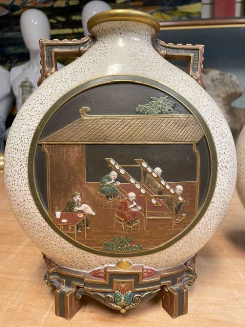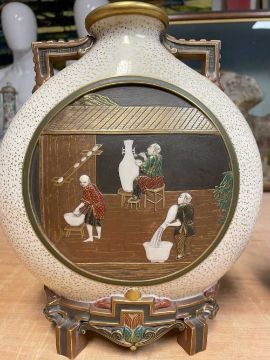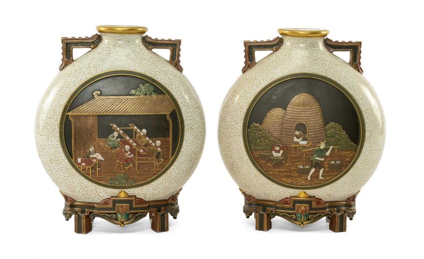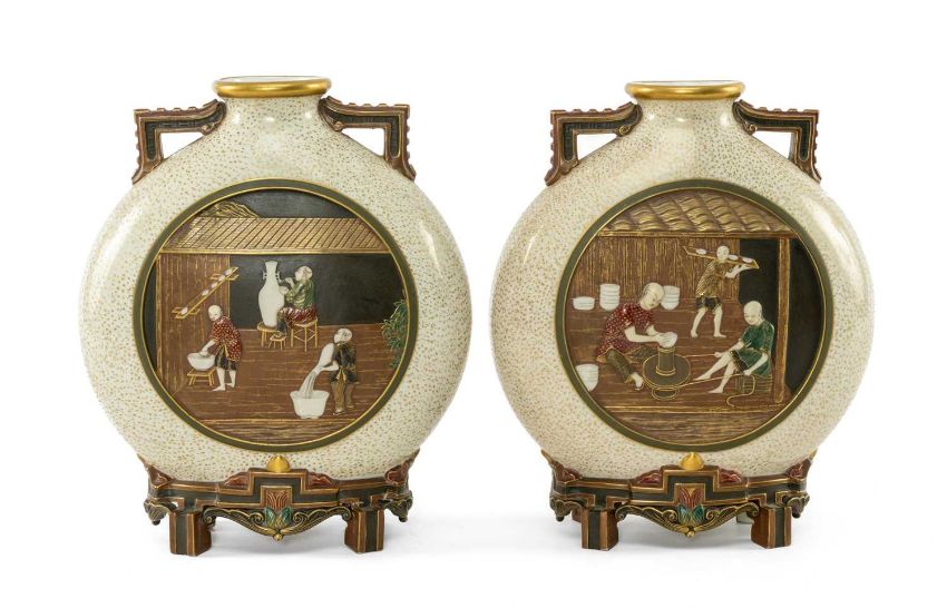RARE PAIR ROYAL WORCESTER 'JAPONISME' MOON FLASKS, dated 1874, in the Aesthetic taste with angular handles and moulded bracket feet, sides decorated in shallow relief with circular panels depicting artisans making and decorating porcelain, reserved on a speckled gilt ground, gilt rims and highlights, printed and moulded marks, incised shape no. 210, date code, 26cms (h) (2)Provenance: private collection CardiffComments: both reglued damaged feet.