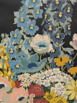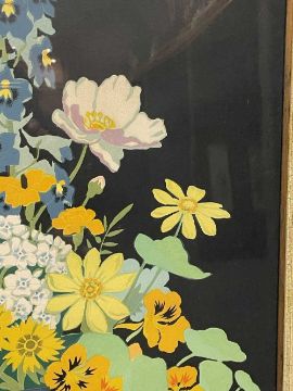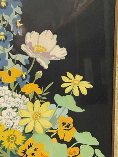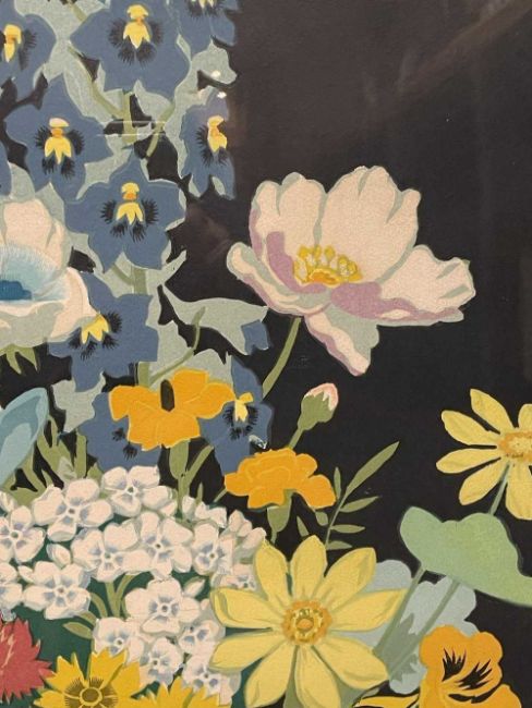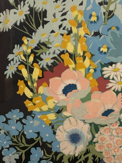JOHN HALL THORPE (1874-1947) woodcut - The Country Bunch, wildflowers in a blue vase with window reflected in the glaze, signed, 75 x 62cmsProvenance: consigned from Cardiff.Comments: framed and glazed, not examined out the frame, frame amateurly sealed with tape verso.