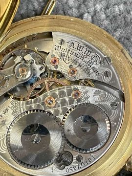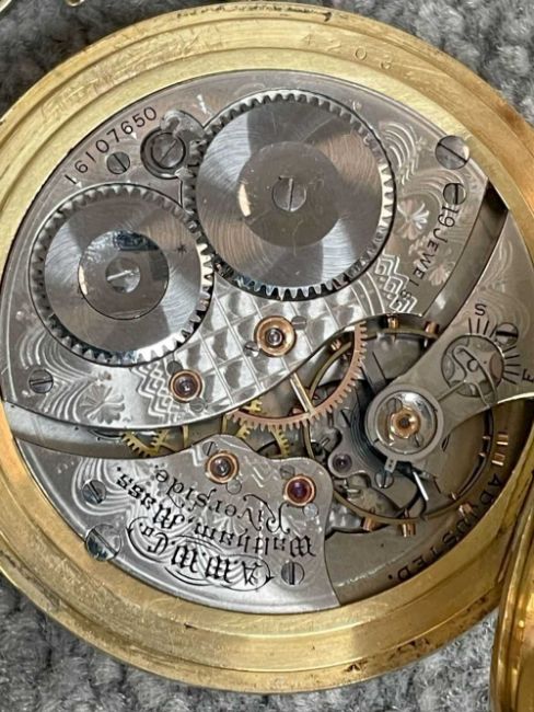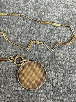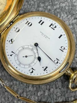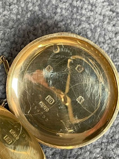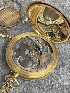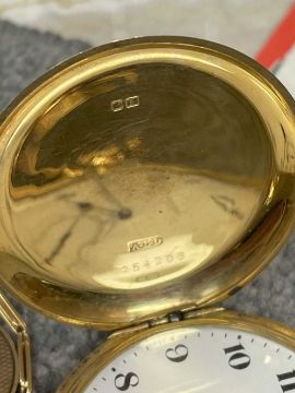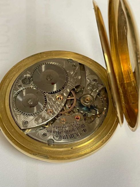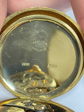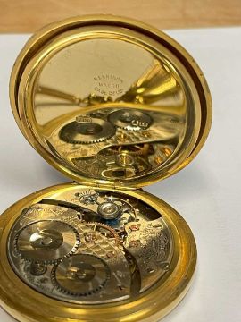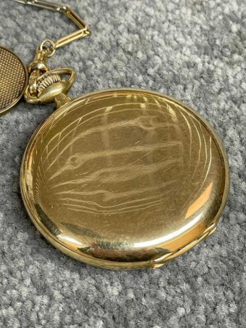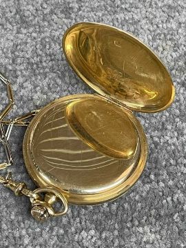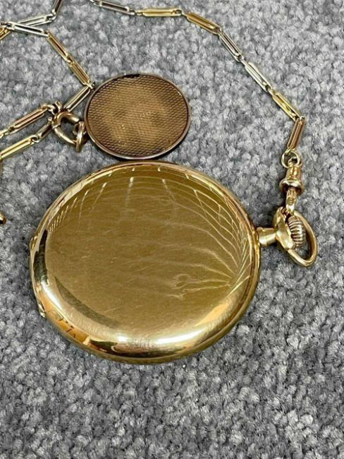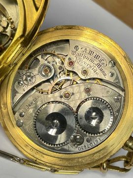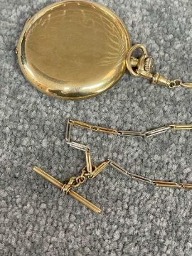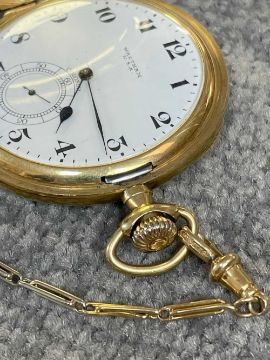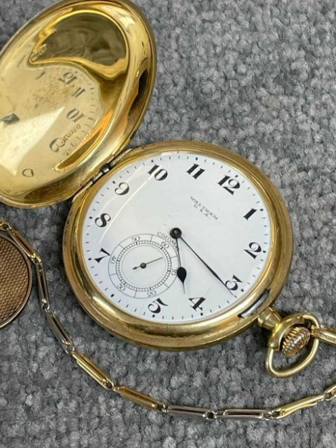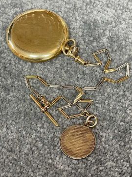 18CT GOLD WALTHAM FULL HUNTER POCKET WATCH, the white enamel dial signed 'Waltham U.S.A. Colonial', Arabic numerals, subsidiary seconds dial, side wind, 18ct gold cuvette, with 18ct gold bi-colour Albert chain with T-bar and yellow metal circular attachment, 104.1gms grossProvenance: private collection GwyneddComments: good overall condition, light wear overall, ticking, not tested long term Condition Report:The movement serial number is 16107650