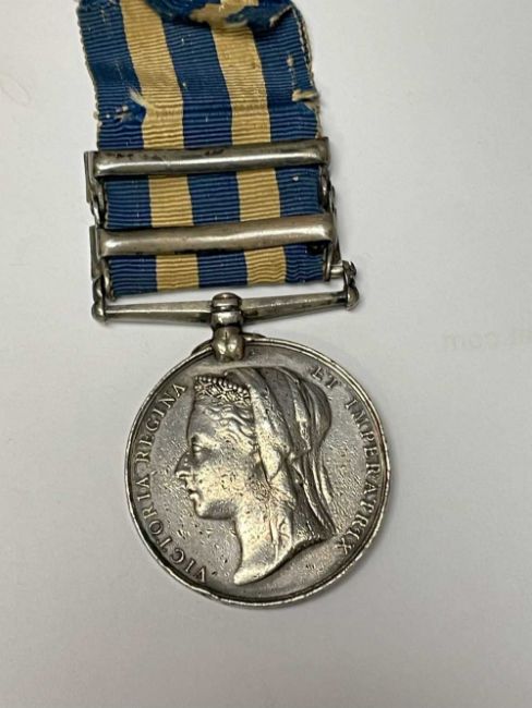 EGYPT MEDAL GROUP OF THREE to Trooper J. Almonds (Royal Horse Guards) 1152, Egypt Medal 1882-1889 with Abu Klea and The Nile 1884-85 clasps, Khedive 1884-6 Star, EVII Long Service & Good Conduct Medal (3)Provenance: private collection CardiffComments: naming on Egypt medal partially erased with dints all over, Star with dent to one point, Long Service with small dent to rim and lacks ribbon, other ribbons ragged.