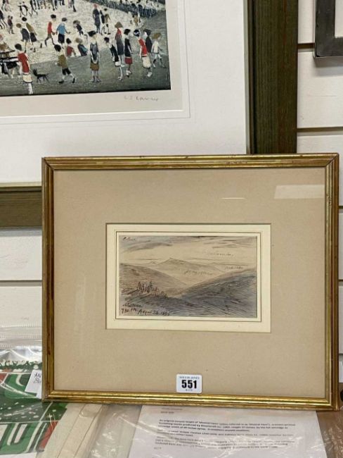 EDWARD LEAR (1812-1888) ink, pencil and watercolour - Passo di Abetone, Italy, annotated and dated '7.30. pm, August 28, 1883', titled verso on gallery label, 9.5 x 17cmsProvenance: With Colnaghi & Co. Ltd., no. 146, English Exhibition, 1973; private collection north Wales.Comments: a little faded, nicely framed and glazed ready to hang.