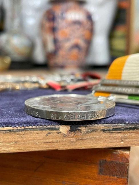 ROYAL WELCH FUSILIERS EPHEMERA & BOER WAR GROUP OF SIX, to Pte. Robert Langford Williams (Royal Welch Fusilers) no. 5891, Queen's South Africa Medal with Orange Free State, Transvaal, Relief of Ladysmith, Tugela Heights and Cape Colony clasps, King's South Africa Medal with South Africa 1901 & 1902 clasps, 1914 Star with clasp and RWF badge, War Medal, Victory Medal with RWF badge and GV Long Service & Good Conduct Medal, all in glazed wood case/frame; together with Lce. Corpl. Robert Williams Character Certificate dated 1920, Royal Welch Fusiliers photograph album containing 27 photographs of soldiers in uniform and in sporting clubs, 1911 map of the Coronation Durba in Delhi, 91 x 75cms (grp)Provenance: consigned from north WalesComments: medals good, album covers worn with loss to spine binding, map discoloured along the creases with tears, inspection advised.