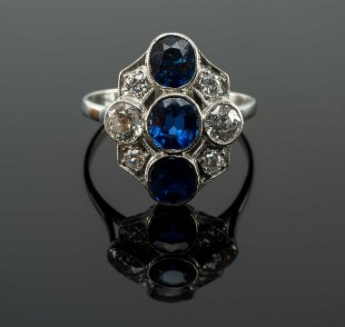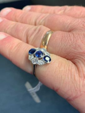 WHITE METAL SAPPHIRE & DIAMOND CLUSTER RING, the three vertical sapphires complimented by six old cut diamonds, ring size L 1/2, 3.1gms, in modern ring boxProvenance: private collection Vale of GlamorganComments: white metal believed platinum, inclusions in diamonds