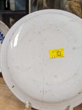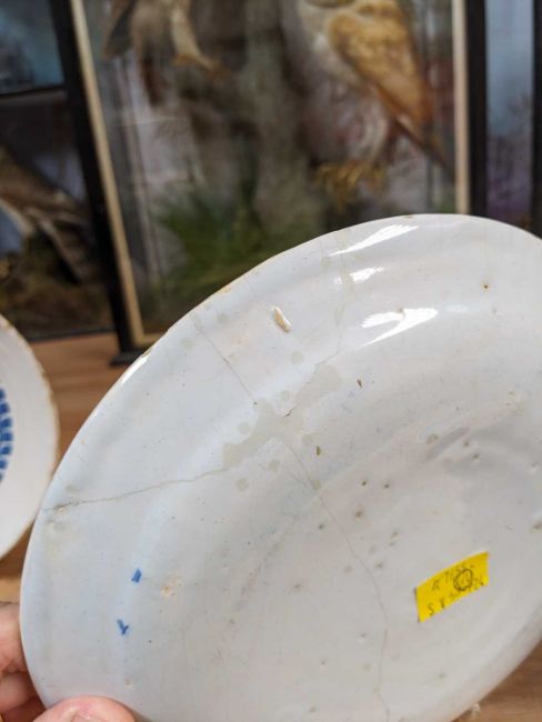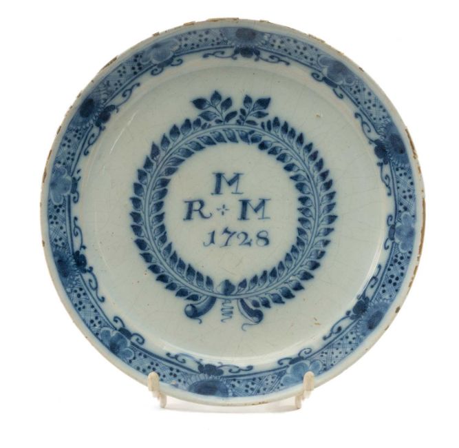 GEORGE II ENGLISH DELFT MARRIAGE PLATE, dated 1728, centre painted with initials 'R+M M' within laurel wreath, the border with Chinese style diaper and foliate band, 21.5cms diamProvenance: private collection Swansea.Comments: cracked/damaged and restored latterly over former rivetted repair, expected fritting and crazing, reverse with stilt marks.