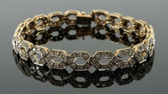 9CT GOLD DIAMOND ENCRUSTED BRACELET, repeating helix design, 19cms long, 14.5gms in boxProvenance: private collection TorfaenComments: stamped '3.03' indicating approx. 3cts of diamonds overall, all stones present, clasp broken