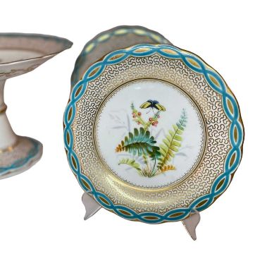 STAFFORDSHIRE BONE CHINA PART DESSERT SERVICE, each piece painted with butterfly above flowers and ferns, within gilt vermicelli and blue interlaced borders, including a tall comport, 19cms (h) (5)Provenance: private collection TorfaenComments: each with pattern no. 204, light wear only