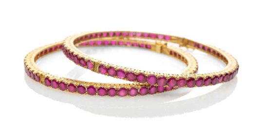 TWO SIMILAR YELLOW METAL BELIEVED RUBY SET HINGED BANGLES, one stamped '22K' the other stamped '22KDM', 54.1gms gross (2)Provenance: deceased estate Neath Port Talbot County BoroughComments: inclusions overall, wear overall, clasps working, viewing recommended