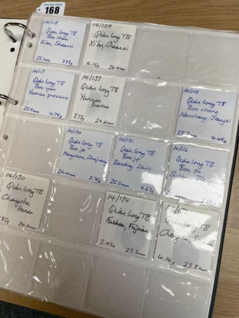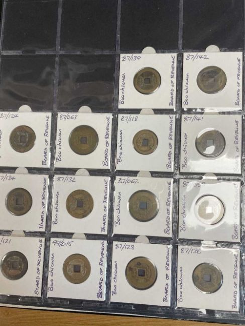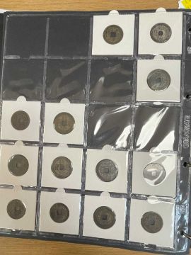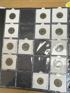 BLUE COIN ALBUM containing various Chinese cash coins including Qianlong Boo-chiowan Board of Revenue cash coins, Boo-yuwan Board of Works, Boo-jin cash coins, including replicas ETCProvenance: deceased estate Swansea, part of a large single-owner collection, many puchased from Dorset Coin CompanyComments: wear overall, sold as seen, descriptions should be regarded as an opinion and not a statement of fact, viewing highly recommended