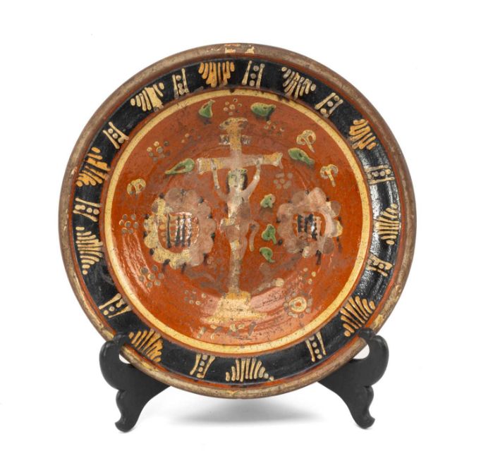 18TH C. SOUTHERN EUROPEAN SLIPWARE POTTERY DISH, dated 1781, decorated to the centre with the crucifixion, within floral border, 34cms (diam.)Proveance: consigned from Rhondda Cynon TaffComment: damage to slipware.