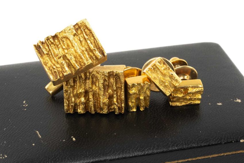 SUTE 18CT GOLD BARK EFFECT CUFFLNKS & SHIRT STUDS, block form with textured faces, leverback links stamped '750', tot wt appr. 29.7g (5)Provenance: private collection PenarthComments: good overall