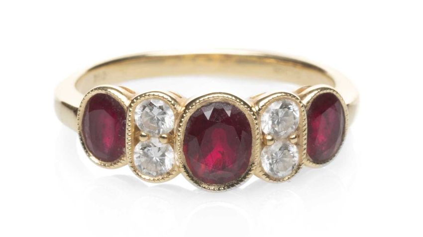 18CT GOLD RUBY & DIAMOND SEVEN STONE RING, ring size L, 3.1gmsProvenance: Torfaen County Borough Comments: good overall, light wear, viewing recommended