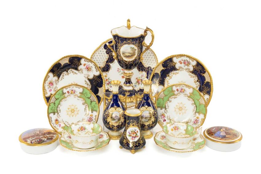 ASSORTED COALPORT PAINTED PORCELAIN, comprising three-handled goblet, 22cms (h), pair of onion shape vases, 16cms (h), small flared vase, 11cms (h), two green ground trios, pair side plates, dessert dish, and two modern Coalport limited edition pot lids on bases (The Maid Servant and St. Paul's Cathedral)Provenance: private collection TorfaenComments: three handled vase damaged, partially repaired, one onion shape vase damaged and reglued, inspection advised