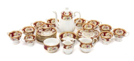 ROYAL ALBERT 'LADY HAMILTON' PATTERN BONE CHINA SERVICE, comprising coffee pot, 10 tea cups, 2 coffee cups, 10 saucers, 2 jugs, 2 sugar bowls, 7 plates (34)Proveance: private collection BarryComments: generally good, inspection advised