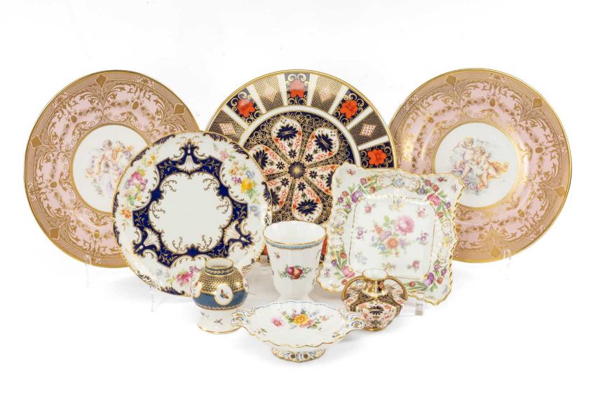 ASSORTED COLLECTABLE BONE CHINA, comprising Royal Crown Derby 1128 pattern Imari cake stand, 28cms (diam.), small Crown Derby Imari vase, small Spode jar, Cauldon dessert dish and pair Caverswall pink ground cabinet plates etc. (9)Provenance: private collection TorfaenComments: Crown Dervy vase with restored handles