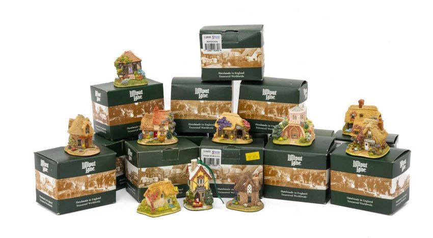 COLLECTION OF LILLIPUT LANE MODELS including, Dove Cote, Dove Cote S/P, Finders Keepers, Where Sparks Fly, Dream Catchers, Santa's Workshop, Catch a Cold, Queen of Hearts, Frosty Fun, The White Swan, Little Tea Caddy, Eagle House Folly x 2, Country Post, Little Snowdrop, Barley Mow Inn (16)Provenance: private collection GwentComments: all boxed, majority with Deed certificate