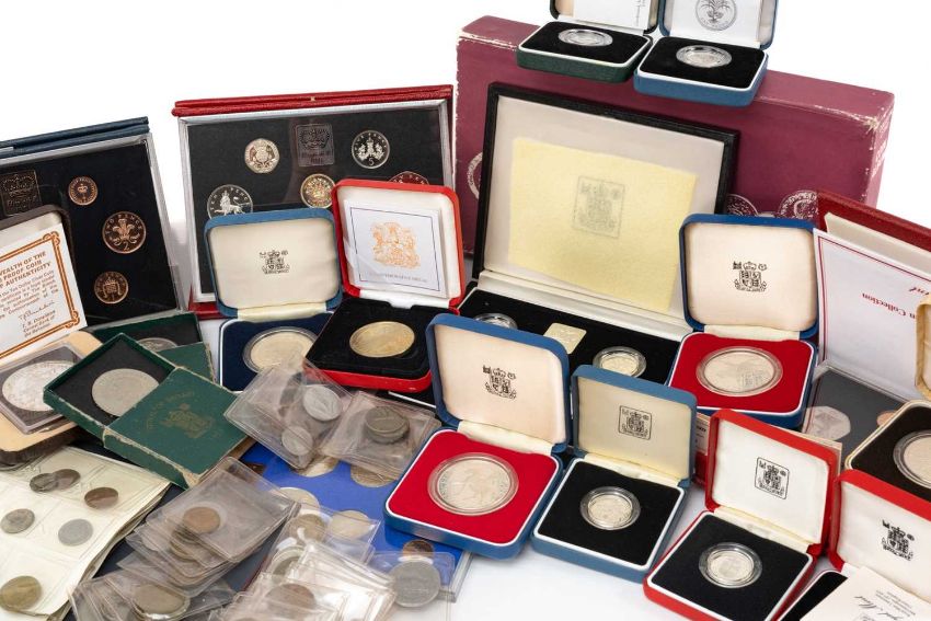 COLLECTABLE COINS comprising boxed coinage of Great Britain and Northern Ireland 1977 set, 3 x boxed United Kingdom proof coin collection sets dated 1984, 1985 and 1986, boxed 1984-1987 United Kingdom £1 silver proof piedfort coin collection, boxed 1990 silver piedfort five pence coin, 3 x boxed silver proof piedfort one pound coin, boxed Bahamas Anniversary Prince Charles $10 proof silver coin, boxed The Queen's Golden Jubilee Commemorative Medal, boxed Lady Diana and Prince Charles marriage silver coin, 2 x boxed silver proof Queen's silver jubilee crown, boxed silver proof one pound coin, boxed 80th birthday proof crown, various commemorative crowns, Festival of Britain crowns ETCProvenance: private collection Carmarthenshire by family descentComments: good overall, wear commensurate with age, viewing recommended
