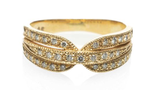 18CT GOLD DIAMOND CHIP RING, bow design, ring size M, 5.0gms in Gassan diamonds ring boxProvenance: deceased estate PembrokeshireComments: good overall, wear commensurate with age, viewing recommended