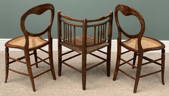 THREE SMALL CHAIRS comprising walnut cane seat corner chair with spindle back and a pair of cane seated balloon back chairsProvenance: private collection Ceredigion