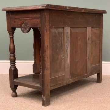 ANTIQUE CARVED OAK DRESSER BASE of narrow proportions and with centre cupboard below three drawers, 77 (h) x 101 (w) x 48cms (d)Provenance: private collection Scotland