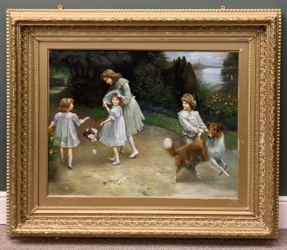 ‡ AFTER ARTHUR JOHN EISLEY (1860-1952) oil on canvas - children picking flowers with dog, 109 x 130cmsProvenance: private collection ScotlandComments: framed