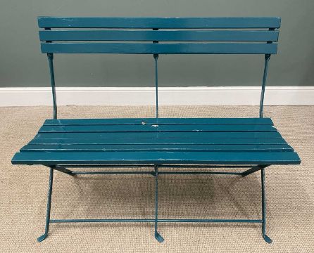 COMPACT WOODEN SLATTED METAL FRAMED GARDEN BENCH painted green, 90 (h) x 107 (w) x 47cms (d)Provenance: private collection Wirral