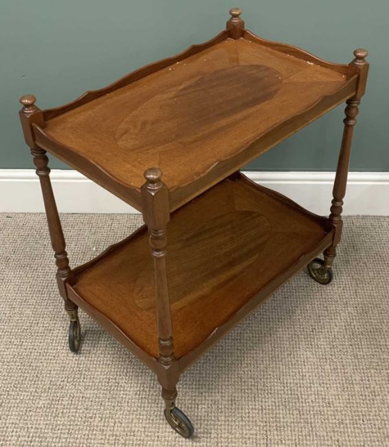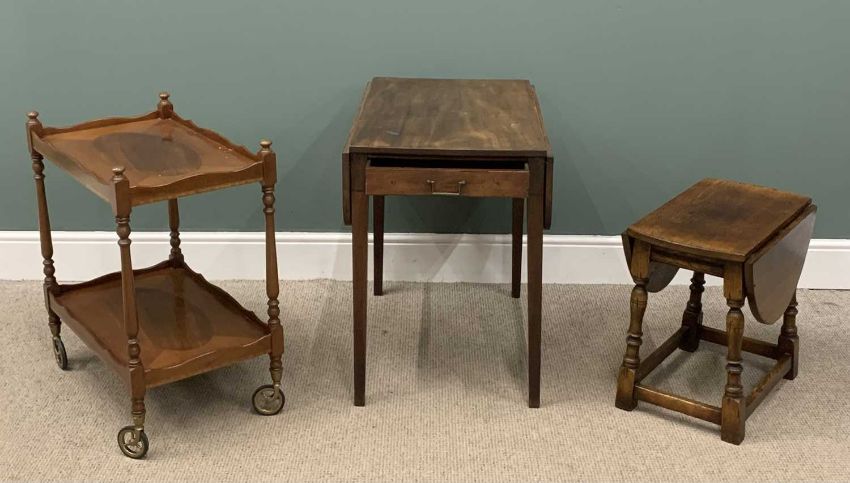 THREE VARIOUS TABLES comprising antique mahogany Pembroke with single drawer, 72 (h) x 52/94 (w) x 94cms (d), two tier tea-trolley and small drop-leaf coffee tableProvenance: private collection Anglesey