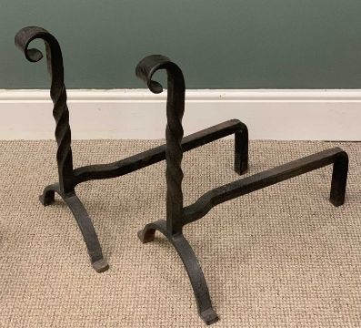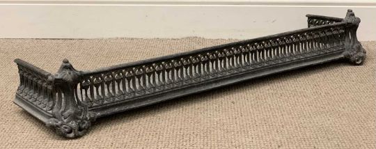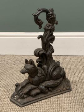 IRONMONGERY comprising substantial cast fire-dogs,59 (h) x 60 (w) x 39cms (d), fender, 20 (h) x 115 (w) x 32cms (d) and Victorian doorstop, 42 (h) x 33 (w) x 7cms (d)Provenance: private collection Denbighshire