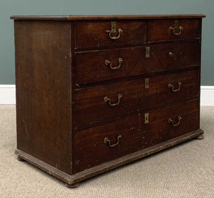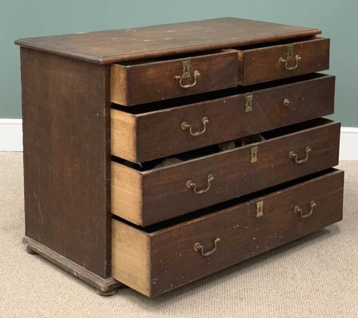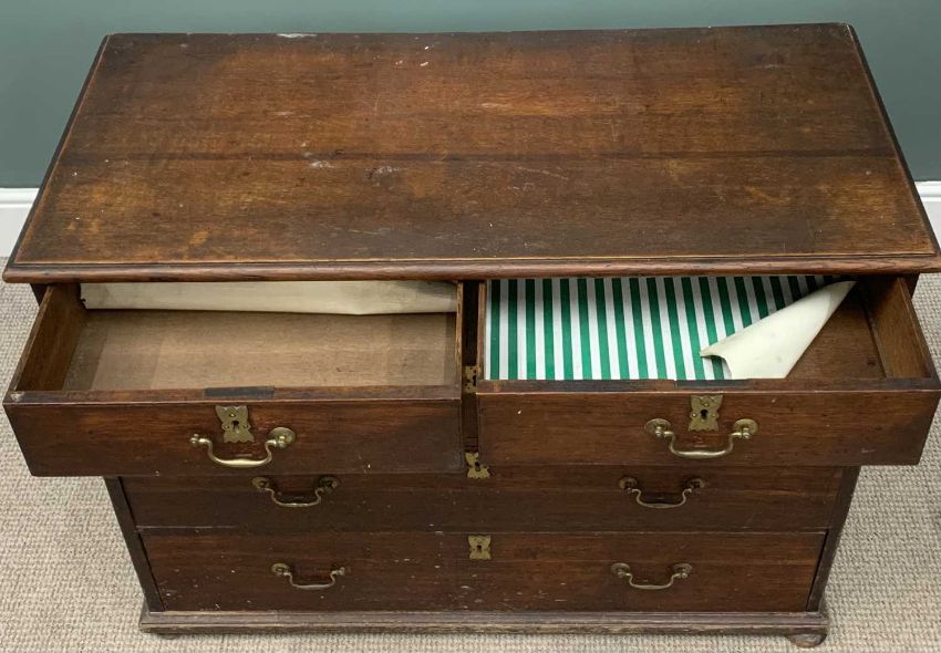 GEORGIAN OAK CHEST of two short over three long drawers with brass drop handles and escutcheons, on small bun feet, 78 (h) x 106 (w) x 50cms (d)Provenance: private collection Denbighshire