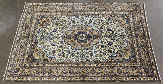 EASTERN KASHMAR RUG beige and cream central repeating diamond with multiple pattern border, 285 x 198cmsProvenance: private collection Cambridgeshire