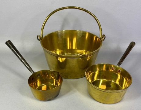 GROUP OF BRASSWARE, mainly 19th century, including circular trivet with swing handle, 27cms (diam.), two Salters spring balance scales, spirit level, ink stand, two pairs of candlesticks and two saucepans with hollow steel handlesProvenance: private collection Denbighshire