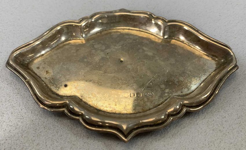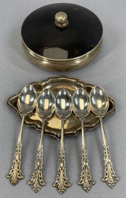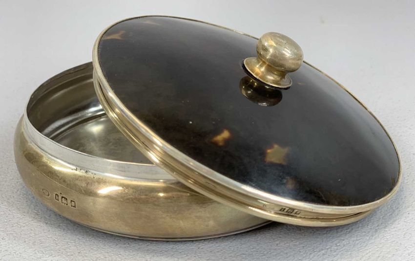 GROUP OF SMALL SILVER ITEMS, George V circular bowl with tortoiseshell cover, London 1924, 11cms (diam.), oval silver pin tray, hallmark rubbed, 13 x 9cms and five Edwardian silver teaspoons, Chester 1907, Hirst Brothers & Co, total 5.5ozt (gross) excluding coverProvenance: private collection Gwynedd