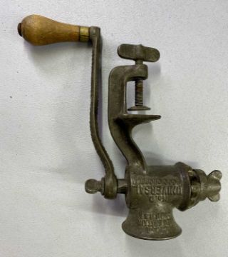 CAST IRON KITCHENALIA, 19th century and later including circular kettle and cover, 31cms (h), goffering iron, 16cms (h), doorstop, 21cms (h), two flat irons, one trivet and a Number 0 universal food chopperProvenance: private collection Denbighshire