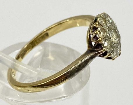 18CT GOLD & PLATINUM DIAMOND FLORAL CLUSTER RING, central 0.25ct round brilliant cut diamond surrounded by eight smaller claw mounted diamonds in an open back coronet setting, size N, 2.7gmsProvenance: deceased estate Conwy