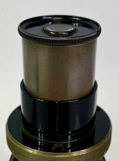 GERMAN OXIDISED BRASS JUNIOR PORTABLE FIELD MICROSCOPE, probably by Spindler and Hoyer, Gottingen, the nickel plated tube with three removable legs, the whole within a cylindrical case, 14cms (l)Provenance: private collection Conwy