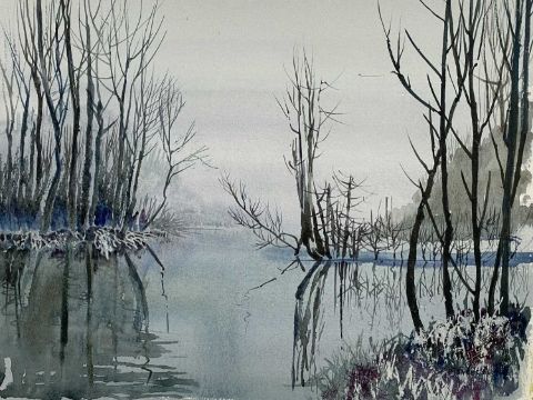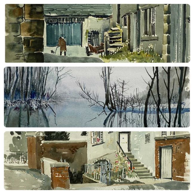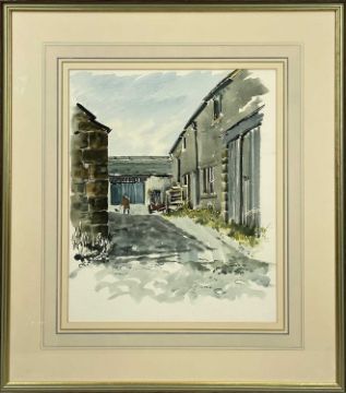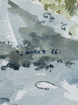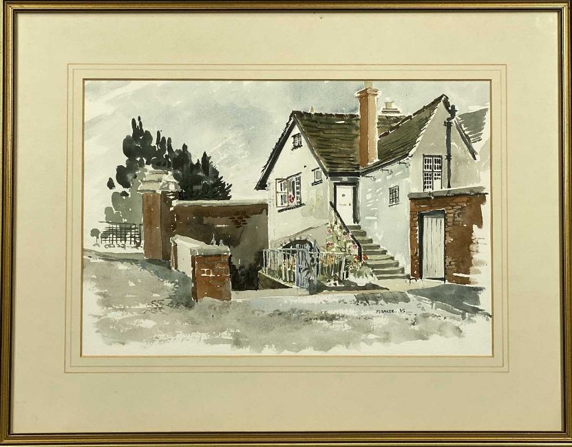 ‡ P. J. (JOAN) BAKER three watercolour studies - comprising an estate lodge building, from her 1985 joint exhibition with Beverley Fry, signed and dated, 24 x 35.5cms, winter woodland/lake scene, 28 x 35cms, farm outbuildings with farmer and dog, 36 x 29.5cms, both signed and dated from her 1986 exhibitionProvenance: private collection ShropshireComments: all framed and glazed