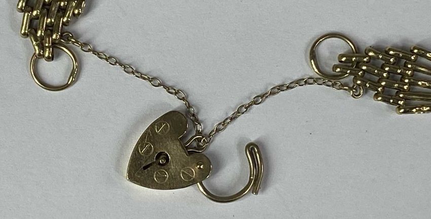 9CT GOLD GATE LINK BRACELET with heart shape locket and safety chain, 13.8gmsProvenance: private collection Ynys Mon