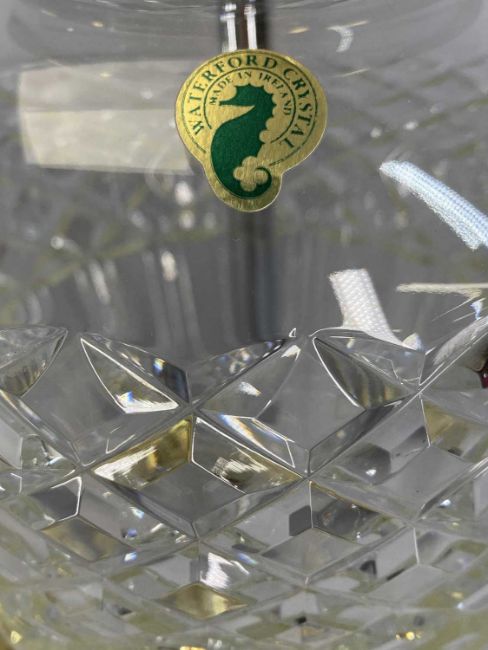 WATERFORD CRYSTAL 'BELLINE' PATTERN TABLE LAMPS a pair, of slender shouldered form, brass effect top and base, 40cms (h) to fittingProvenance: private collection Isle of Man