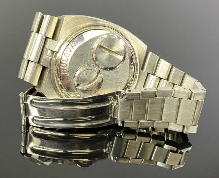 BULOVA ACCUTRON STAINLESS STEEL GENTLEMAN'S WRISTWATCH circa 1975, Tonneau shaped 'TV' case with rounded square skeleton dial, luminous batons to the chapter ring, white and luminous block hands, orange centre seconds, back numbered 3-551191 on manufacturer's stainless steel braceletProvenance: private collection Denbighshire