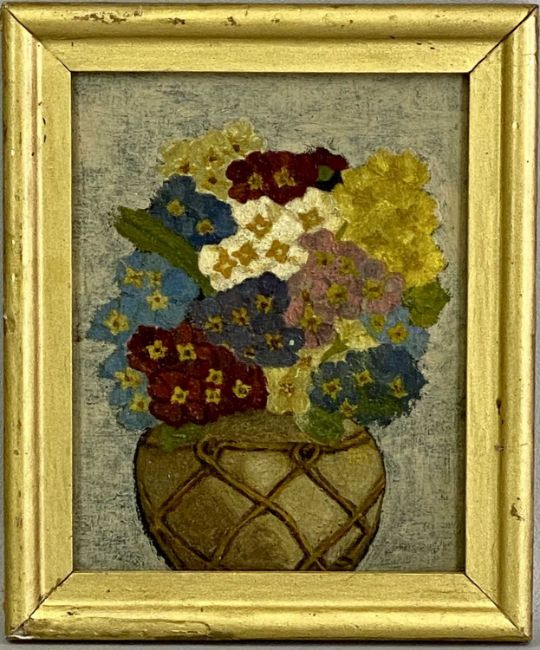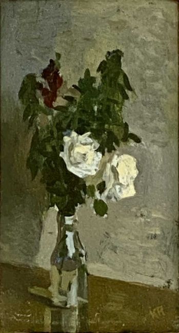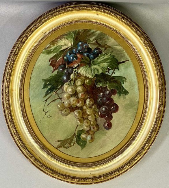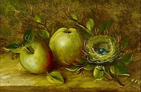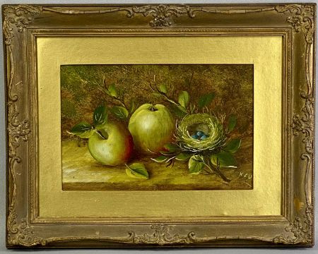 VARIOUS ARTISTS/MEDIUMS: KENNETH ROWNTREE oil on panel - entitled verso 'Two White Roses', monogrammed lower right, 17.5 x 9.5cms, UNKNOWN oil on canvas - still life vase of flowers, unsigned, 23.5 x 18.5cms, MONOGRAMMED L.B 1881 watercolour - entitled 'North Wales', 16 x 23cms, oil on board in the manner of Olivier Clare - still life birds nest and apples, 19 x 28.5cms, UNKNOWN oval oil - still life grapes, 37 x 32cmsProvenance: private collection ConwyComments: framed and glazed