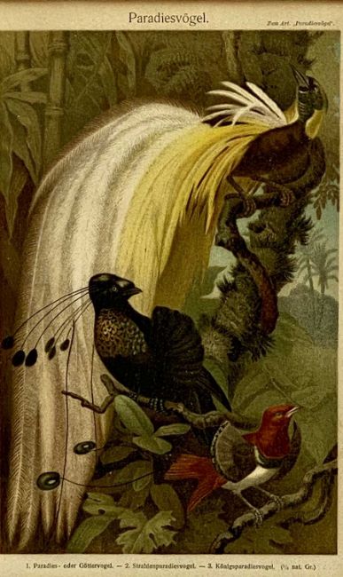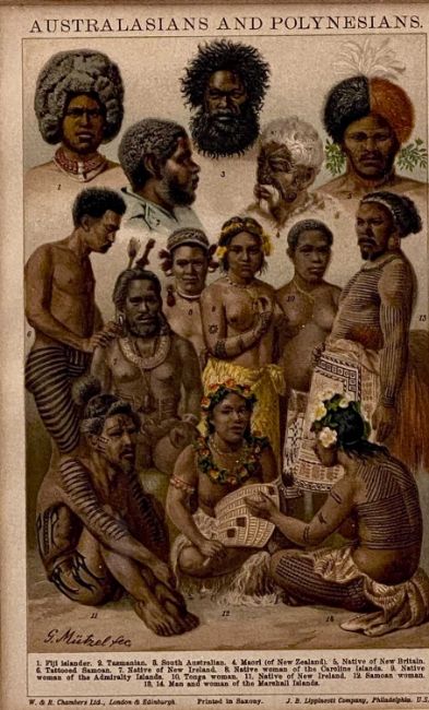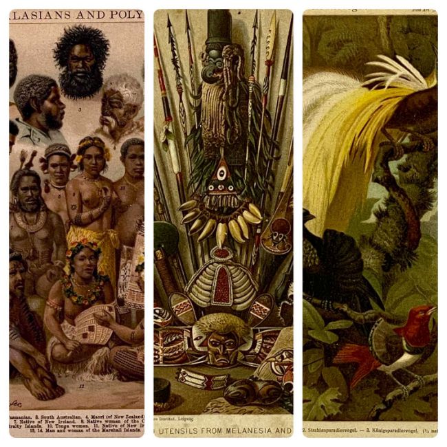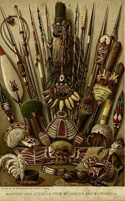 GUSTAV LUDWIG MUTZEL (German 1839-1893) two colour lithographs with printed signatures - entitled 'Weapons and Utensils from Melanesia and Micronesia', 'Paradiesvogel' and 'Australasians and Polynesians', 22.5 x 15cms together with another similar without printed signatureProvenance: deceased estate ConwyComments: framed and glazed