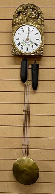 FRENCH COMTOISE WALL CLOCK, late 19th/early 20th century, the circular convex white enamel dial with black Roman numerals, signed Darnais Au Coteau, the pressed brass surround with religious figures, with twin weights and brass pendulum, the case, 39 x 25.5cmsProvenance: private collection Conwy