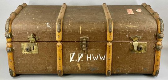 VINTAGE HAND CRANK SEWING MACHINE by Jones in wooden case, and a wooden banded steamer trunkProvenance: private collection Anglesey