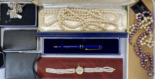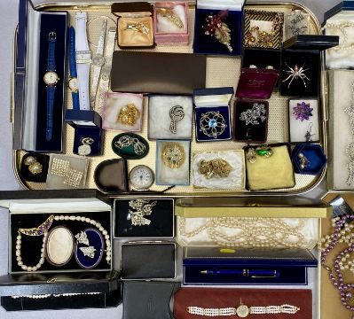 LARGE SELECTION OF COSTUME JEWELLERY including brooches, simulated pearls, rings and earrings, mostly boxedProvenance: private collection Conwy