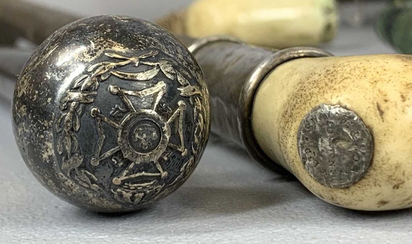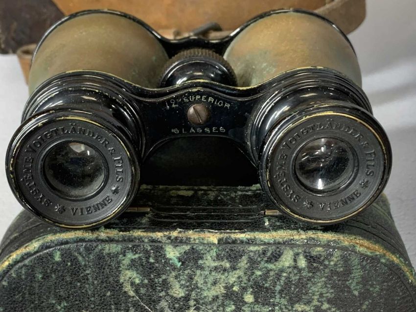 VINTAGE COLLECTABLES GROUP, some riding / hunting related, Carl Zeiss Jena DRP binoculars in leather case, Swine & Adeney leather riding crop with silver collar and antler handle, leather case containing metal sandwich box and glass flask, one other metal sandwich box, whistle with lanyard, various spurs etc.Provenance: private collection Denbighshire