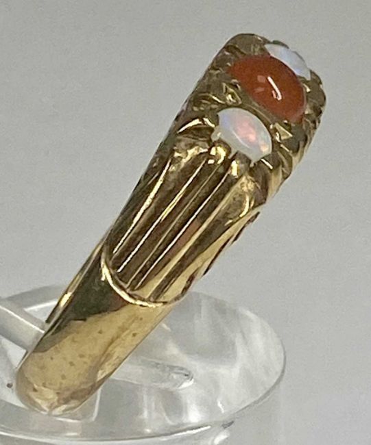 9CT GOLD RING set with central orange garnet, flanked by opals, size P, 5.7gmsProvenance: private collection Conwy