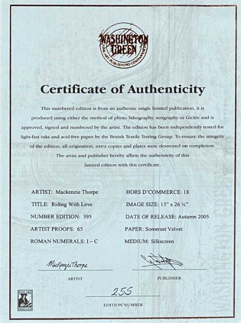 MACKENZIE THORPE (English b.1956) limited edition print - 'Riding with Love', with certificate, 42 x 76cmsProvenance: deceased estate Conwy