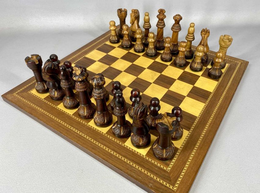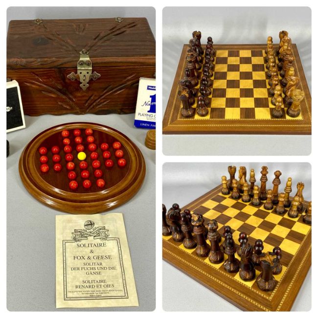 WOODEN GAMES BOARDS comprising inlaid and carved chess board and chesspieces, 45cms², a solitaire board with marbles, together with a carved wooden boxProvenance: deceased estate Anglesey